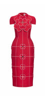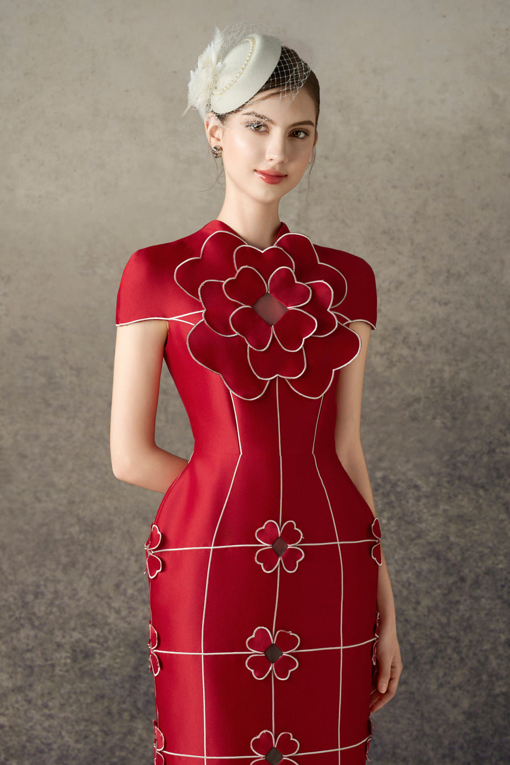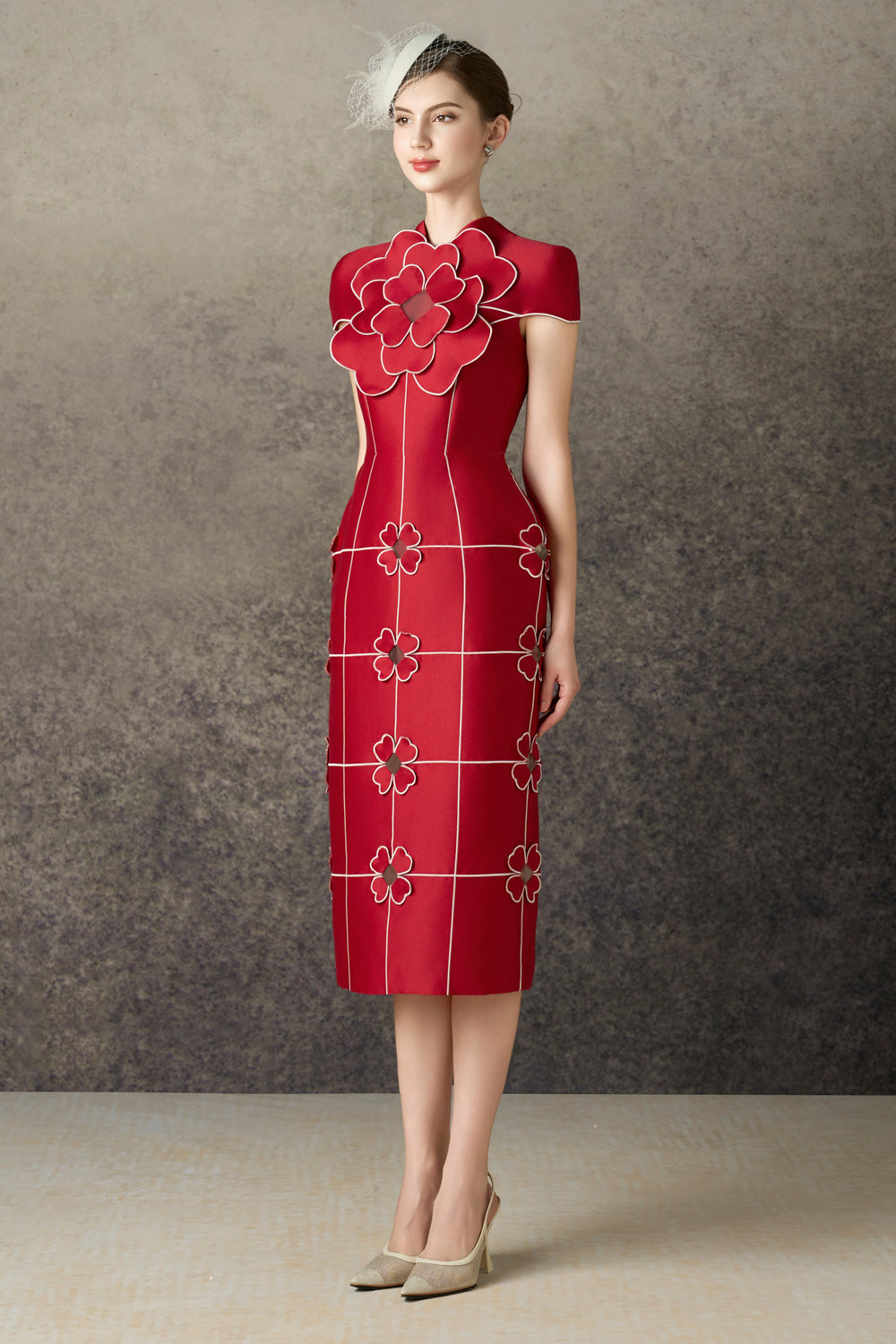 The dress combines a sleek pencil silhouette with intricate 3D floral appliques for a refined, textured look. Its signature shoulder-mounted clam sleeves add architectural interest and elevate the dress’s elegant profile. Crafted from smooth taffeta, this midi dress offers a tailored fit that accentuates the figure, making it an ideal choice for sophisticated occasions demanding both style and craftsmanship.