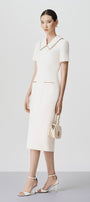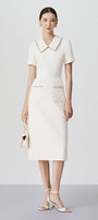 This wool calf length dress boasts a charming peter pan collar and elegant gold tinsel hem, creating a timeless and sophisticated look. The precision of the dart lines ensures a flattering fit for any body type. Elevate your wardrobe with this classic and refined piece.