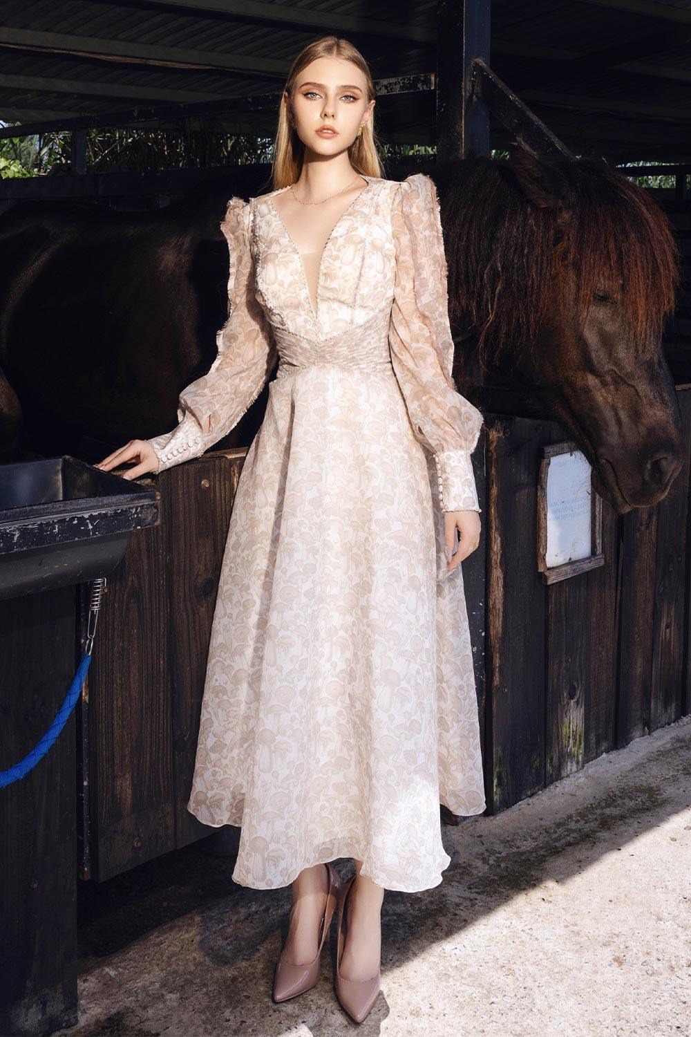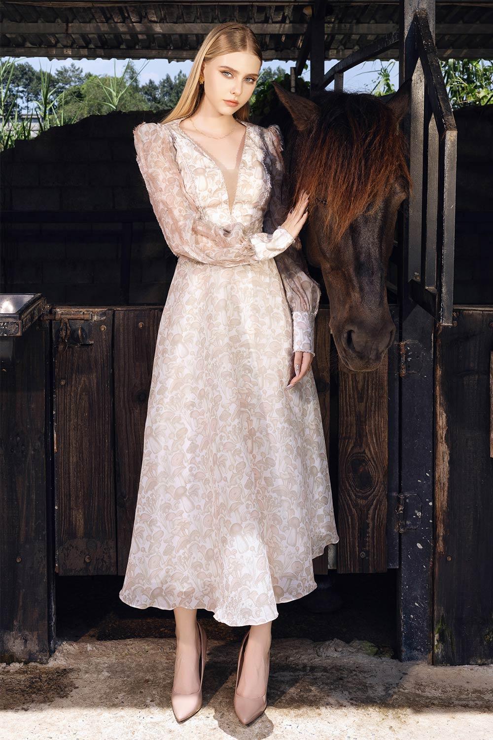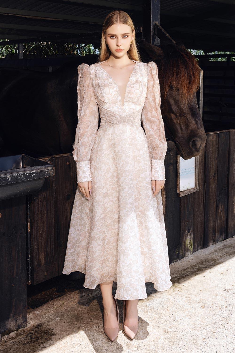 Special Features: Mushroom pattern, Fitted waist with gathered detail, High slit cuff with long button line, Lace trimming on neckline and waist seam, Wavy hem, Fringe seam along sleeves