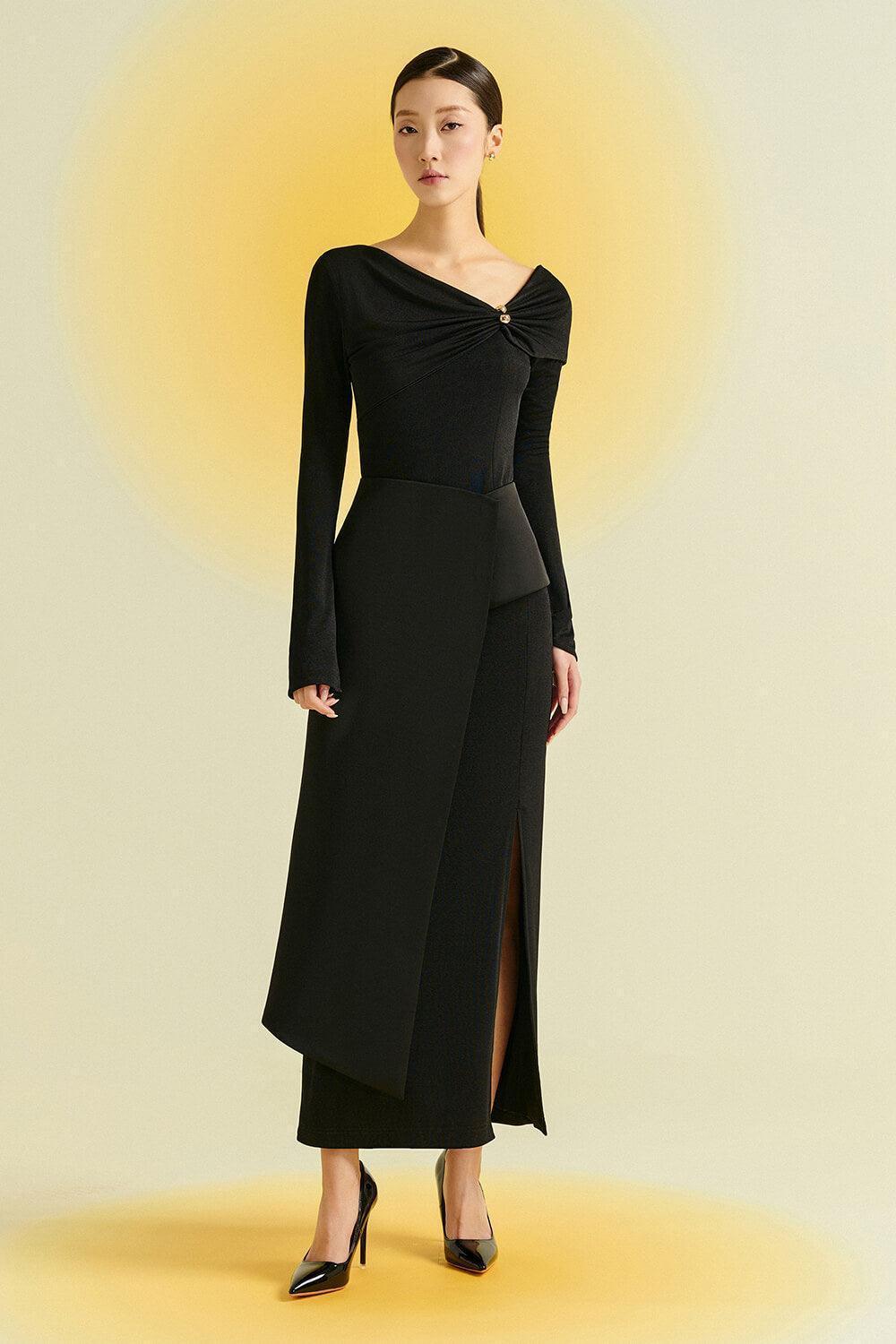 Indulge in luxury with the dress. Made with premium spandex taffeta, this ankle length dress features an extended flap for a unique and elegant touch. Elevate your style and make a statement at your next event.