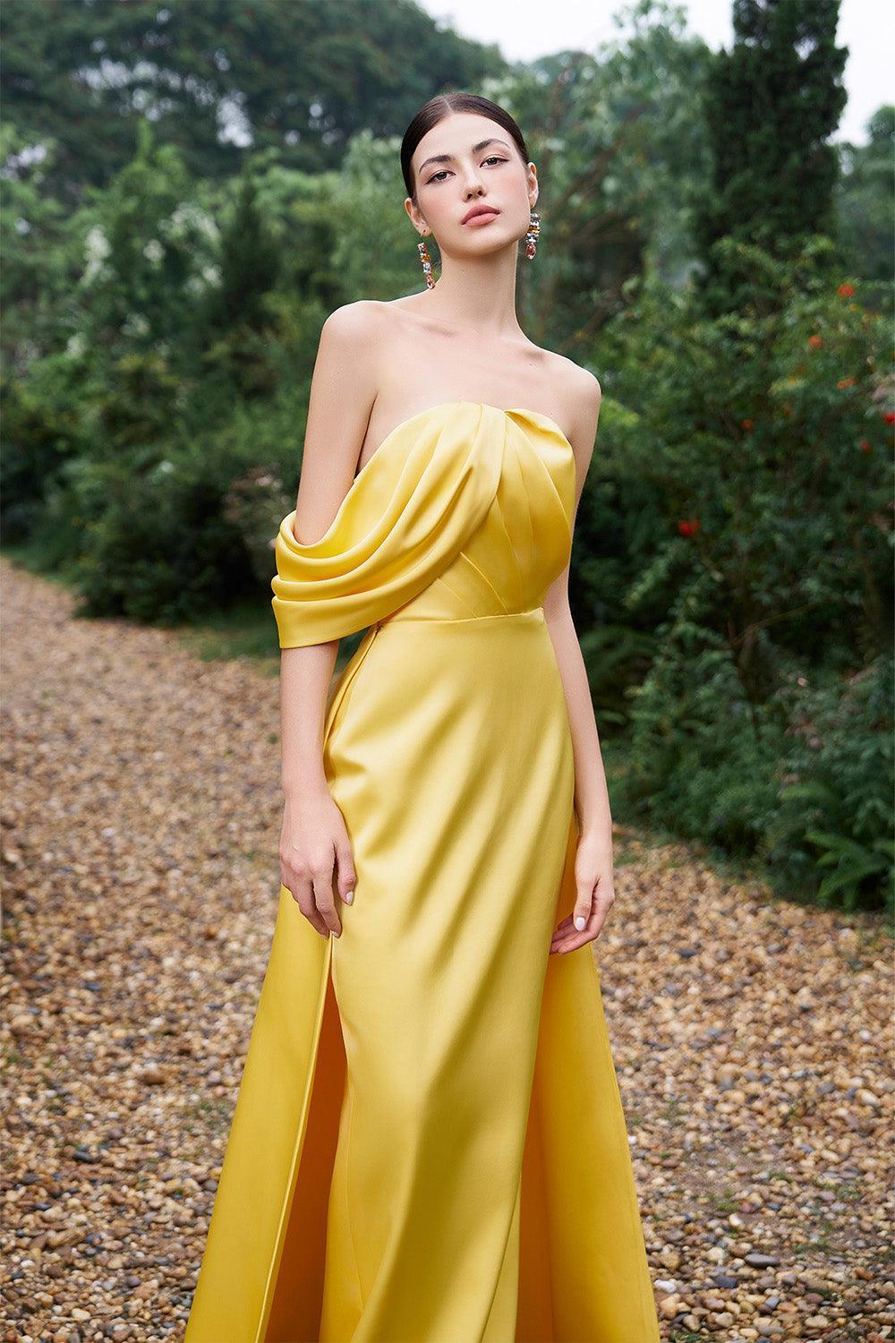 Expertly crafted with high-quality poly silk, this dress exudes elegance and sophistication. Its off-shoulder design adds a touch of femininity, while the floor length cut creates a flattering silhouette. Perfect for any formal occasion, feel confident and stylish in this timeless dress.