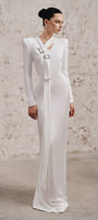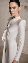 This floor-length bodycon dress features a sophisticated square neckline and a tie neck detail with a metal buckle, combining elegance with a modern edge. Crafted from a silk-spandex blend, it offers a smooth, comfortable fit that contours the body while allowing ease of movement. Ideal for formal occasions, this dress balances timeless style with contemporary design elements.