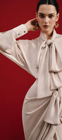 This silk satin shirt features a straight cut with elegant cuff sleeves and a sophisticated tie neck detail. Crafted from smooth satin, it offers a refined drape and subtle sheen, making it ideal for both professional and upscale casual settings. The tie neck adds a polished touch, while the straight silhouette ensures a flattering fit. Perfect for layering or wearing alone, this shirt combines timeless style with luxurious comfort.