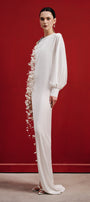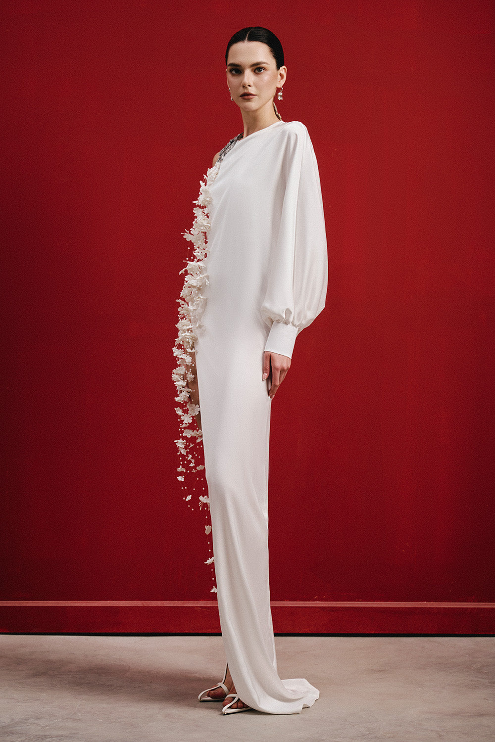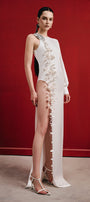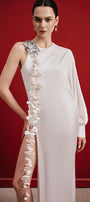 Elevate your evening wardrobe with the dress. Featuring a sophisticated asymmetric design and a flattering round neckline, this dress combines elegance with modern style. The high slit adds a touch of allure while allowing ease of movement. Crafted from luxurious silk satin and adorned with delicate flower appliques, it offers both comfort and refined beauty for special occasions.