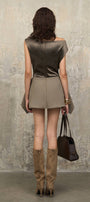 Expertly tailored, this bodycon mini dress features a striking asymmetric neckline paired with draped and ruched detailing, creating a sculpted silhouette. Ideal for cocktail parties, date nights, or upscale events where a sophisticated yet modern look is essential.