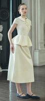 Elevate your wardrobe with the top, expertly crafted to combine structure and elegance. Featuring a refined peplum silhouette that flatters the waist, this top incorporates corset boning for subtle shaping and support. The classic flat collar adds a touch of timeless charm, while the luxurious khaki silk fabric ensures a smooth, sophisticated finish. Perfect for both professional settings and stylish evenings, this top offers a polished look with expert tailoring details.