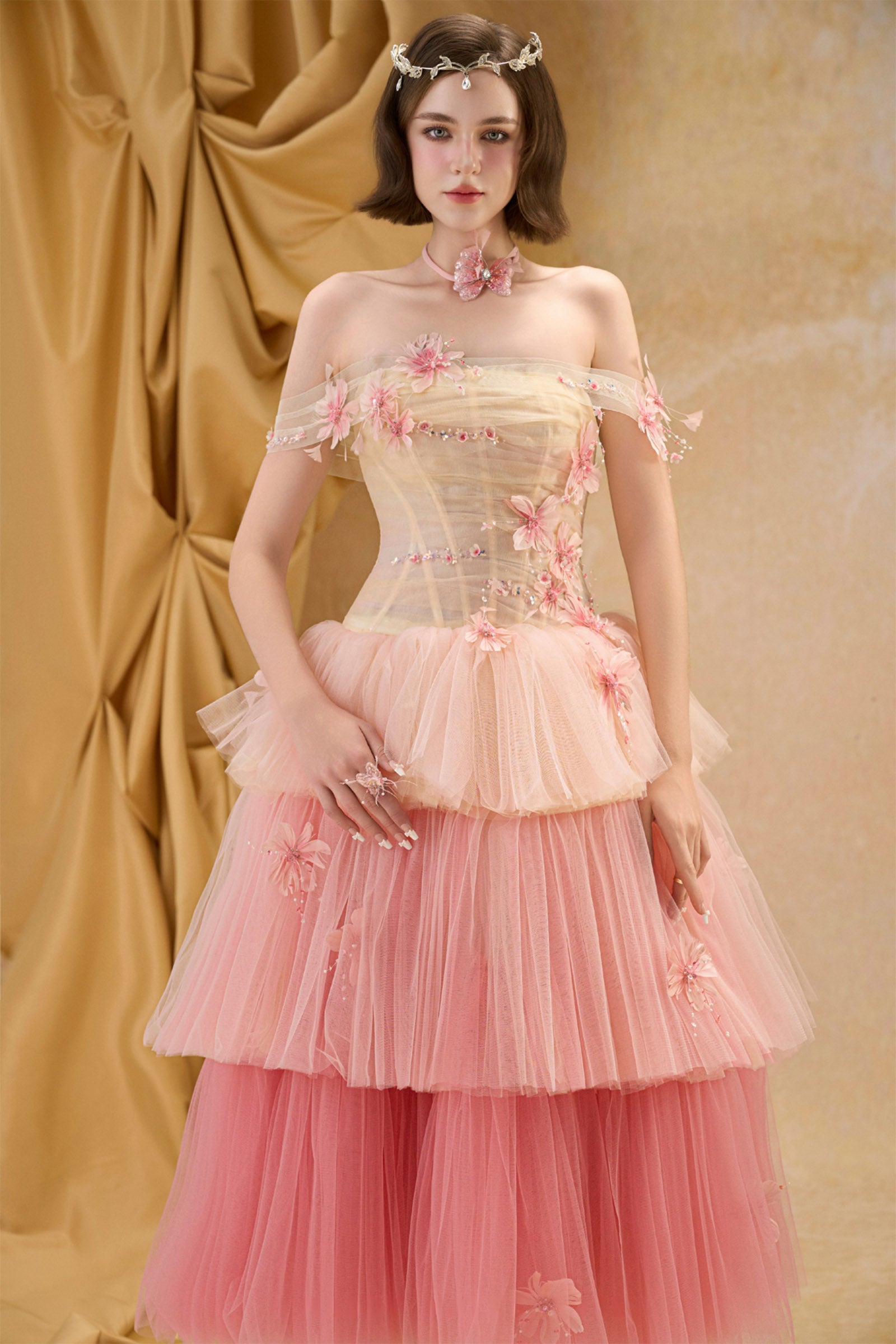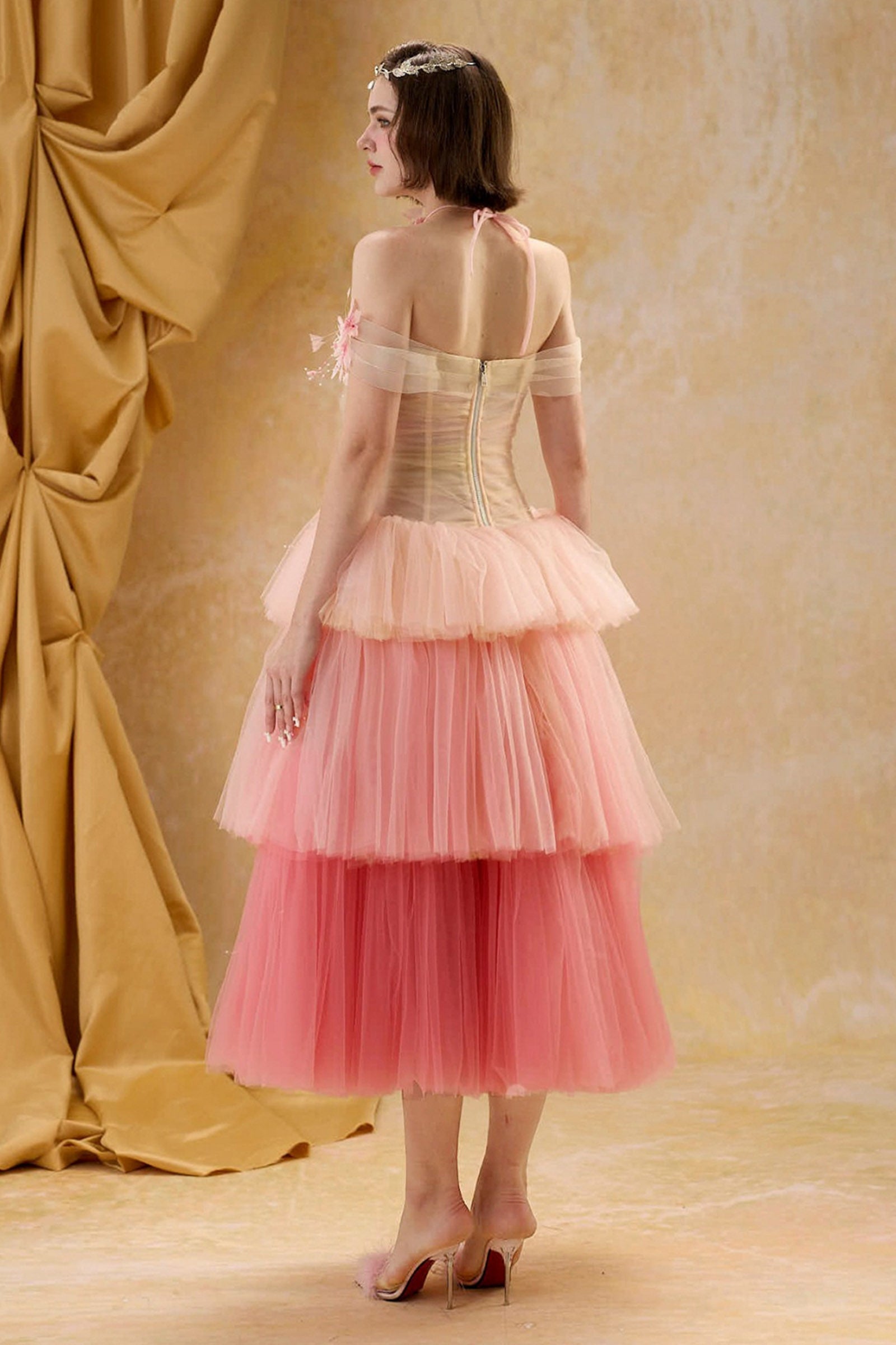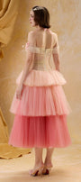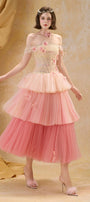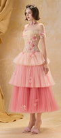 Expertly crafted from soft tulle, this A-line midi dress features an elegant off-shoulder neckline, gathering, and exquisite appliqué and bead embellishments. Perfect for formal events, weddings, or upscale soirées where refined style is essential.