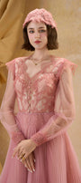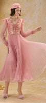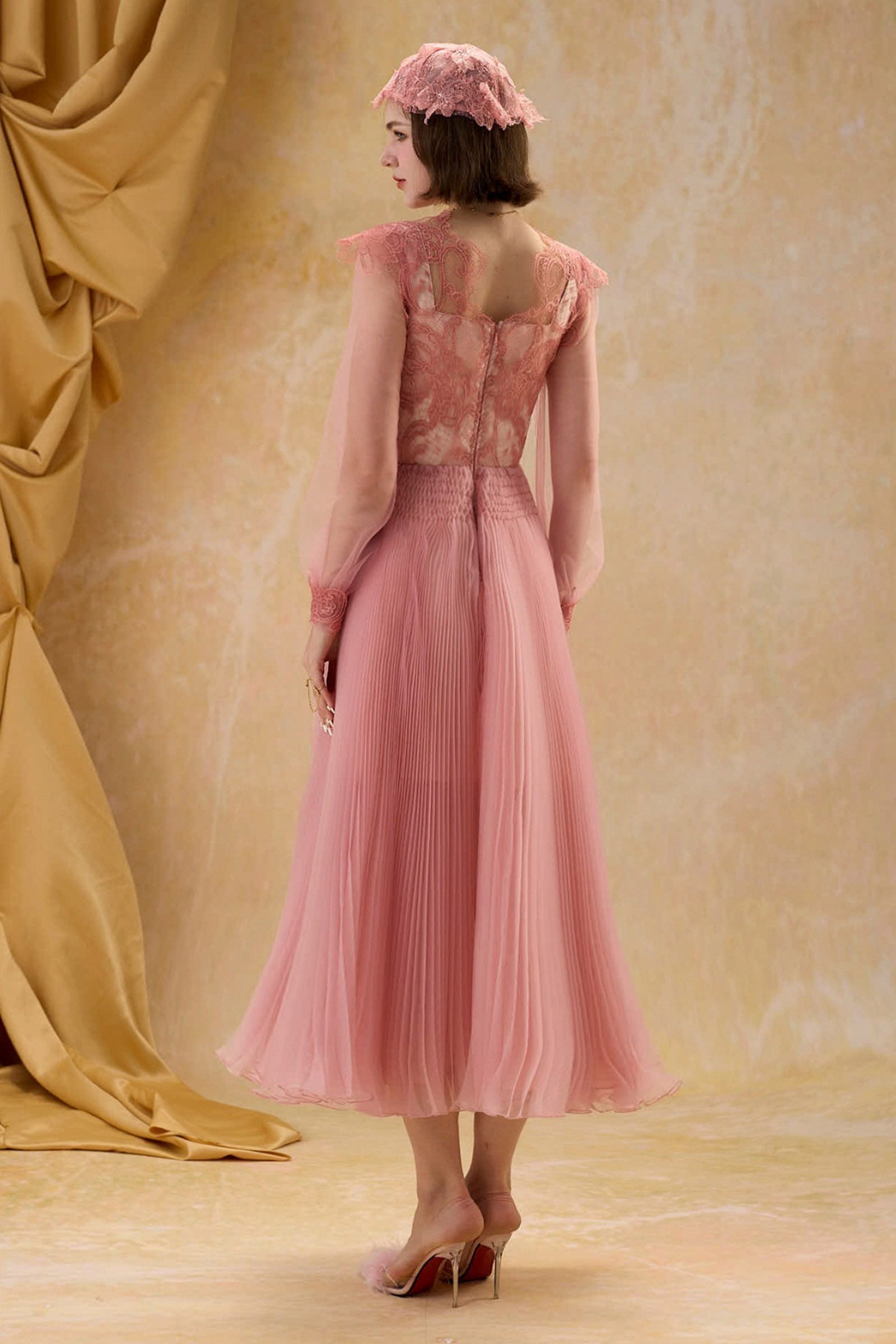 Expertly crafted from luxurious silk, this A-line midi dress features a sweetheart neckline, bishop sleeves, and exquisite pleated and shirring details. Applique embellishments and button accents add finesse. Perfect for weddings, cocktail parties, or elegant evenings out.