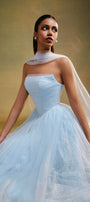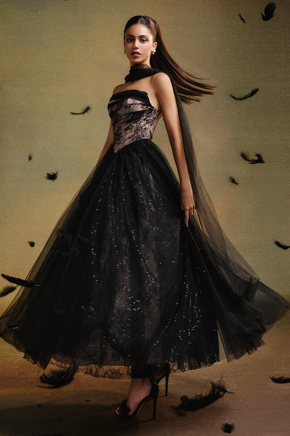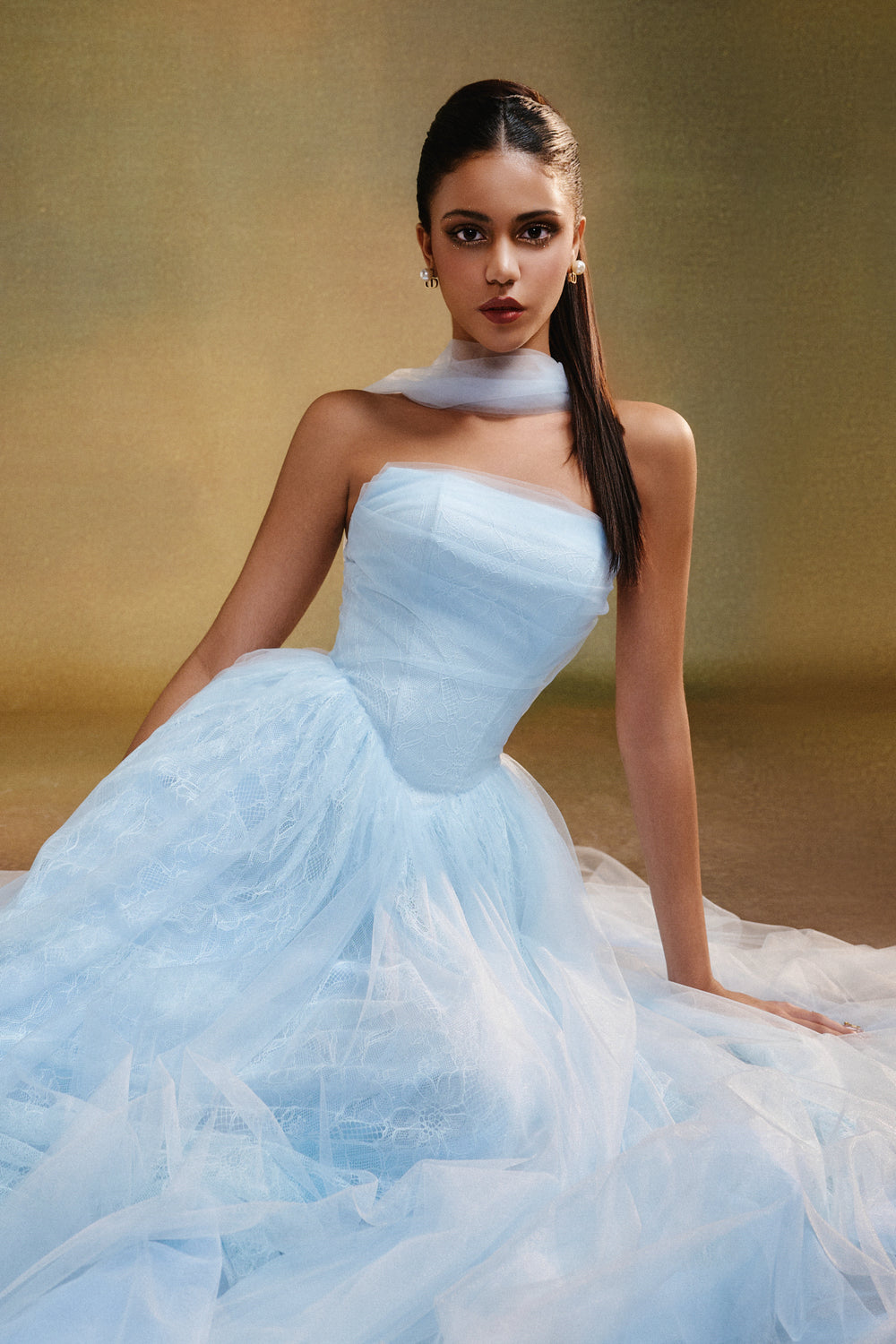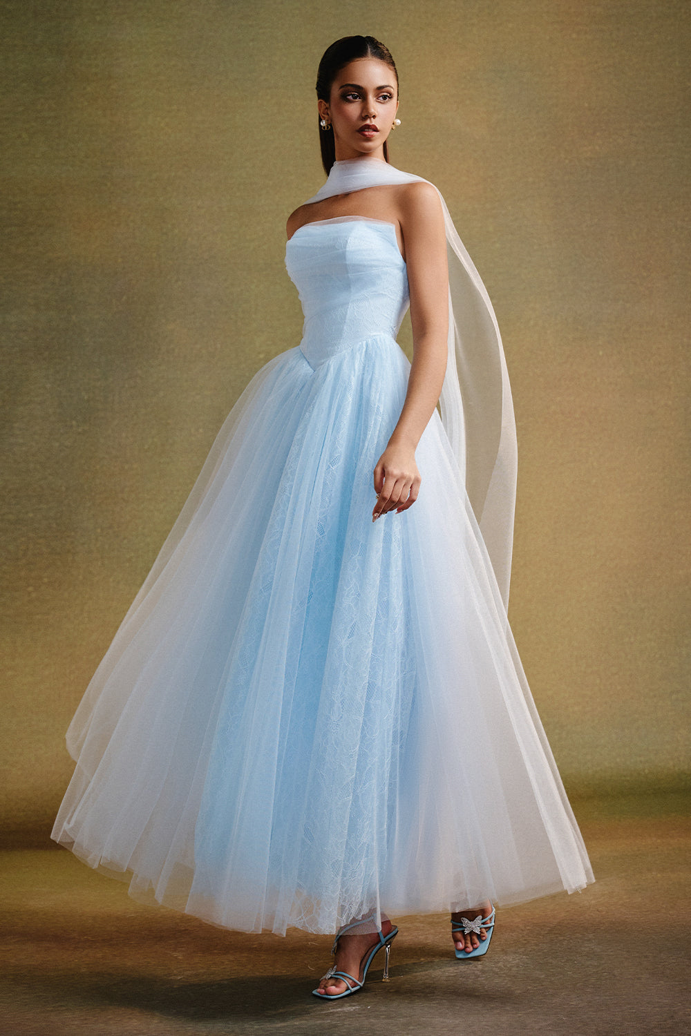 Expertly crafted from elegant lace, this ball gown maxi dress features a straight-across neckline and subtle gathering for a sophisticated touch. Ideal for formal events, weddings, or evening galas.