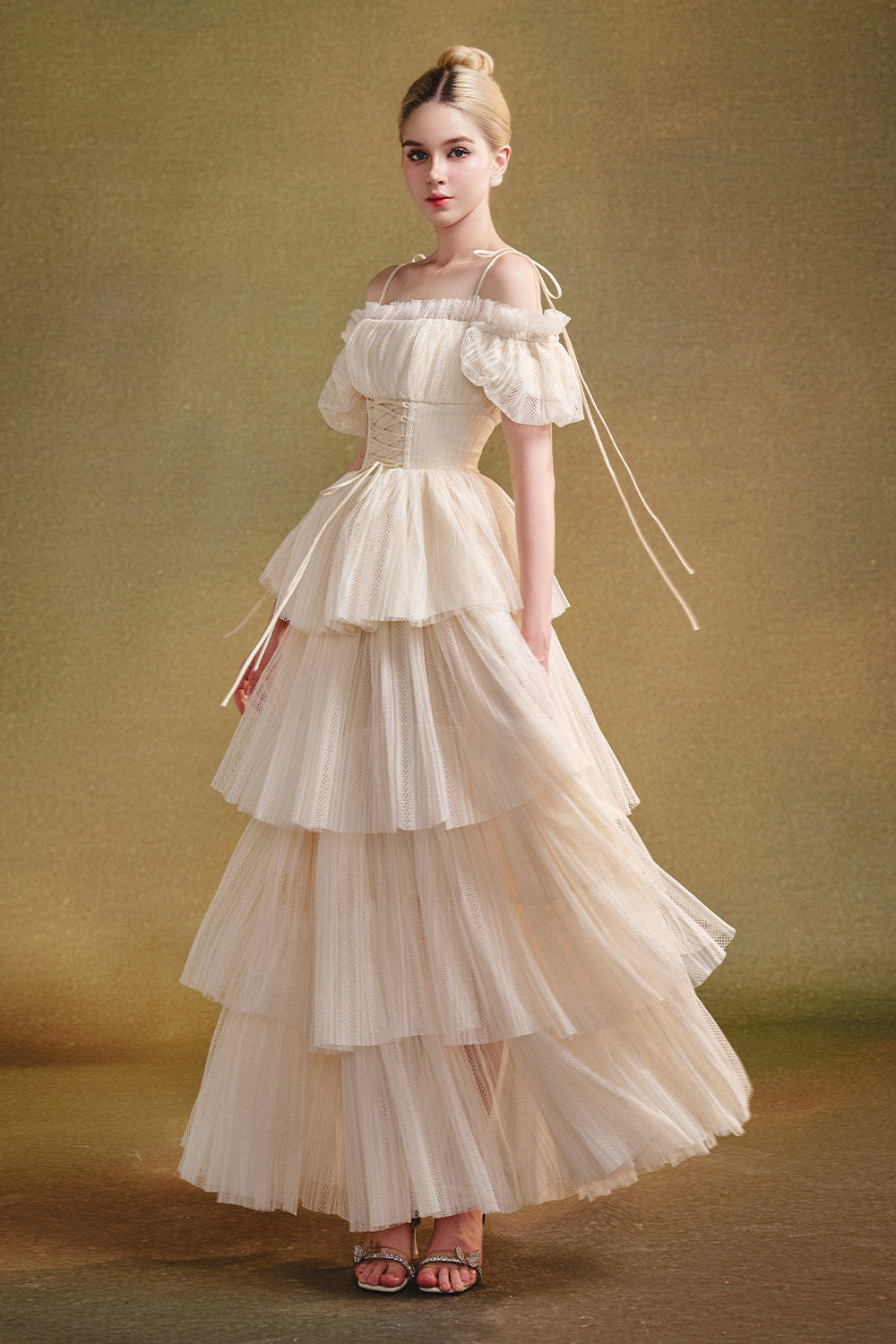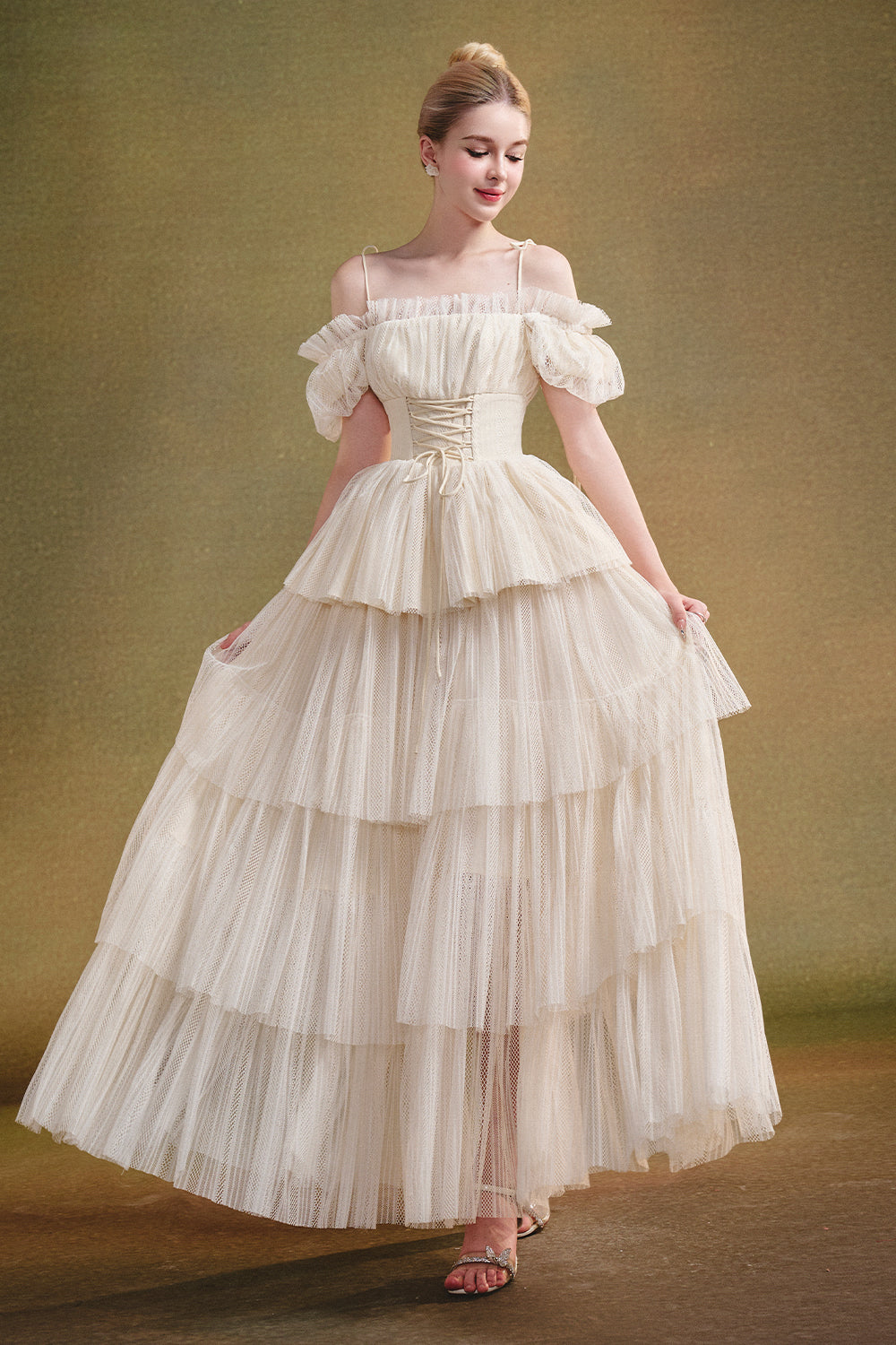 Elevate your elegance with this A-line mesh maxi dress, featuring a sophisticated square neck, cold shoulder sleeves, ruffle embellishments, and graceful gathering details. Ideal for weddings, evening events, or upscale parties.