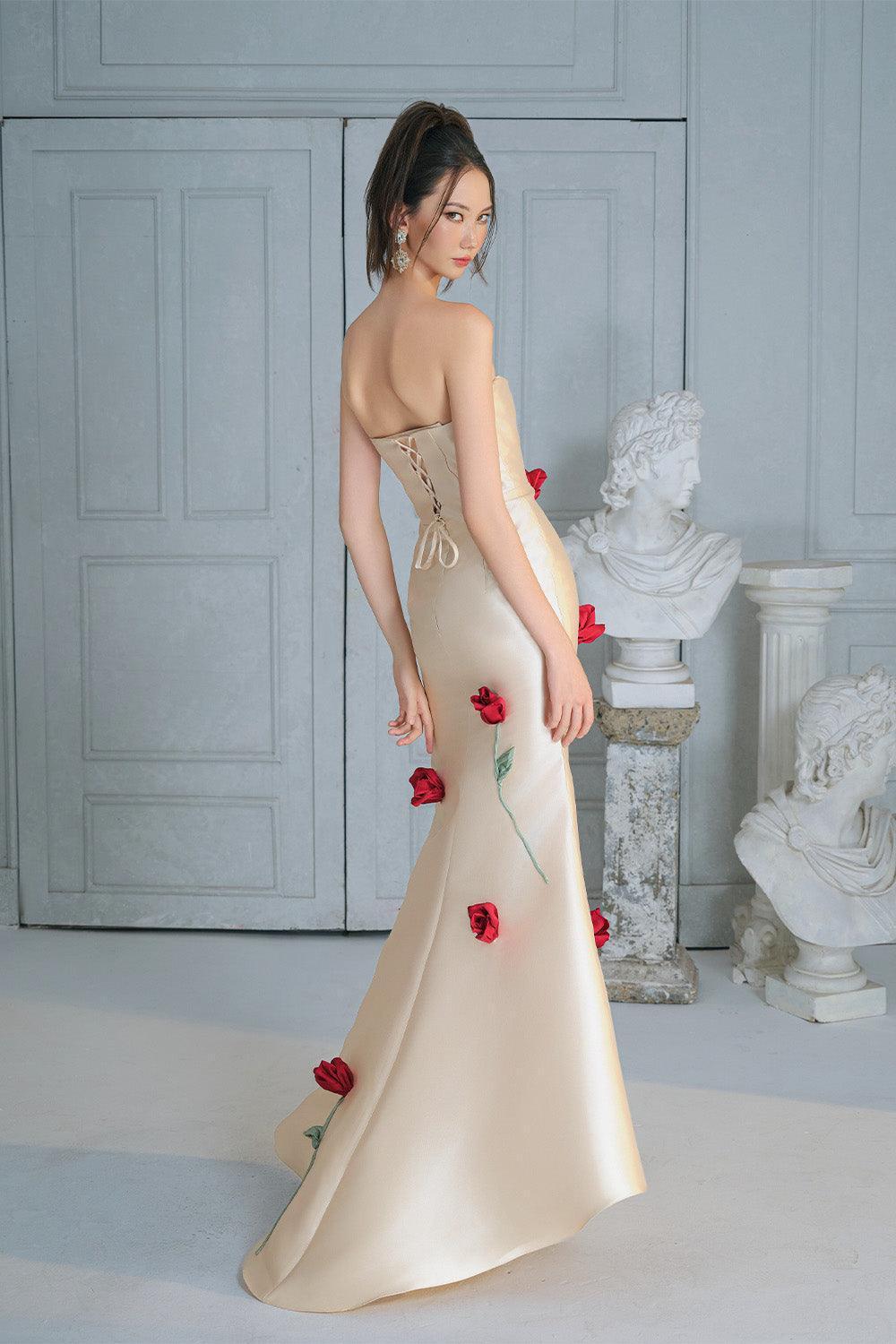 Two-layer chest cup, 3D roses attached along the dress, Fisheye darts, Asymmetric front-back flap