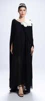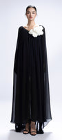 Elevate your style with this expert-crafted straight silhouette maxi dress in chiffon, featuring a scoop neck, elegant cape sleeves, delicate applique embellishment, and artful gathering detail. Perfect for weddings, evening events, or upscale gatherings.