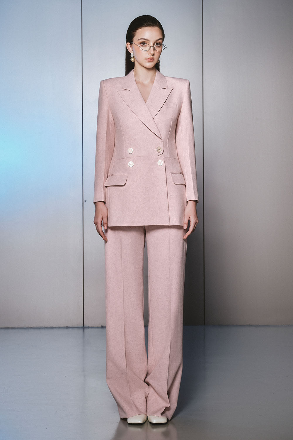 Peak lapels, Double-breasted with curve hem, Dart lines, Flap pockets, Square shoulder, Button on the cuff