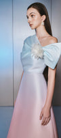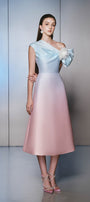 Asymmetric shoulder with bow on the side, Dart lines, Ombre transition pink and blue