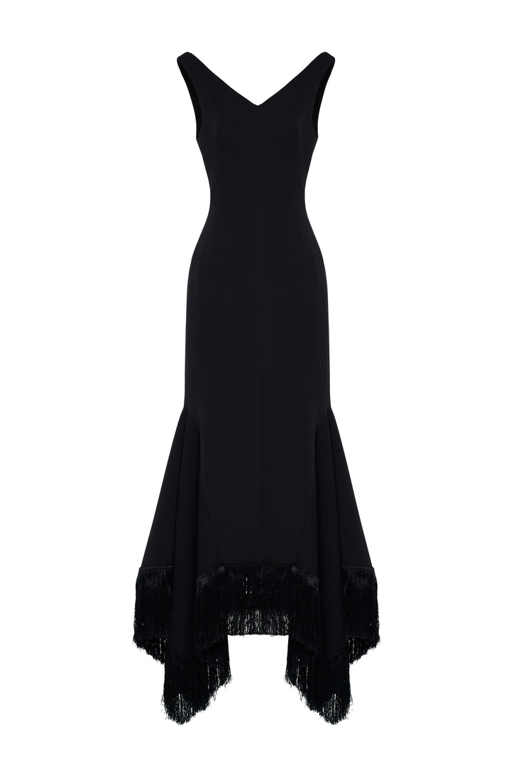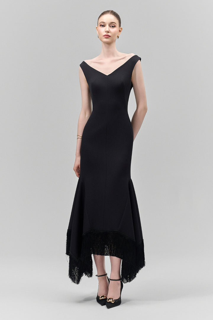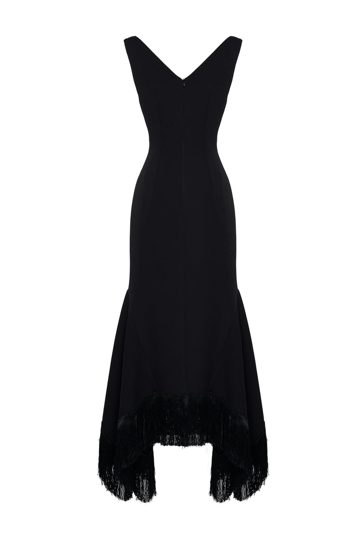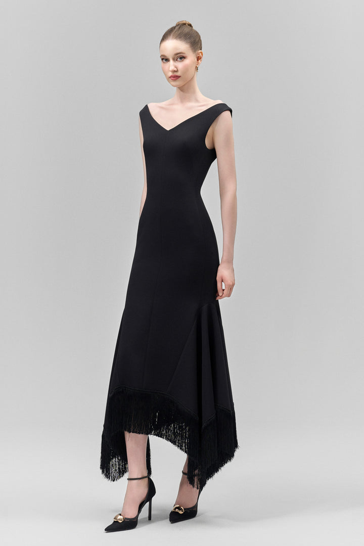 This dress features a flattering V-neckline and a figure-hugging mermaid silhouette that enhances your curves elegantly. The crepe fabric provides a refined texture and comfortable fit, while the fringe detailing on the hem adds a subtle movement and distinctive flair, perfect for making a sophisticated statement at any event.