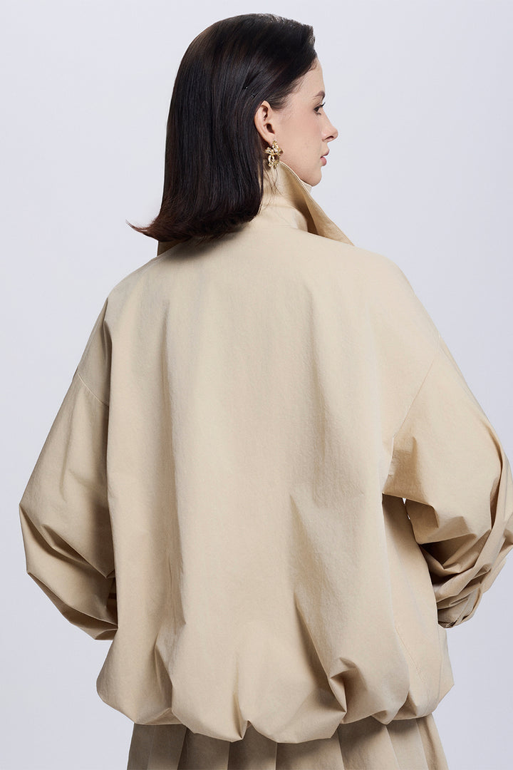 The jacket features a double zipper for versatile wear and a high neck design that provides both style and subtle protection. Its pleated sleeve cuffs add a refined architectural detail, enhancing the elegant silhouette. Crafted from luxurious khaki silk, this jacket offers a sophisticated, lightweight layering option suitable for expert wardrobes.