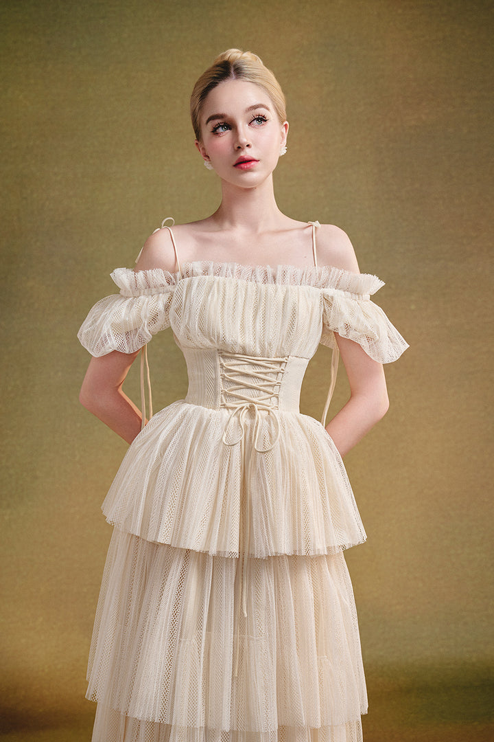 Elevate your elegance with this A-line mesh maxi dress, featuring a sophisticated square neck, cold shoulder sleeves, ruffle embellishments, and graceful gathering details. Ideal for weddings, evening events, or upscale parties.