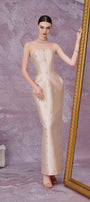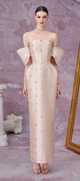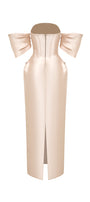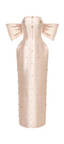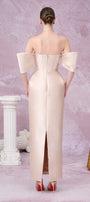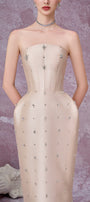 Attached rhinestones along the dress, Cinched waist with boning , Detachable sleeves, Slit back, Draped hip