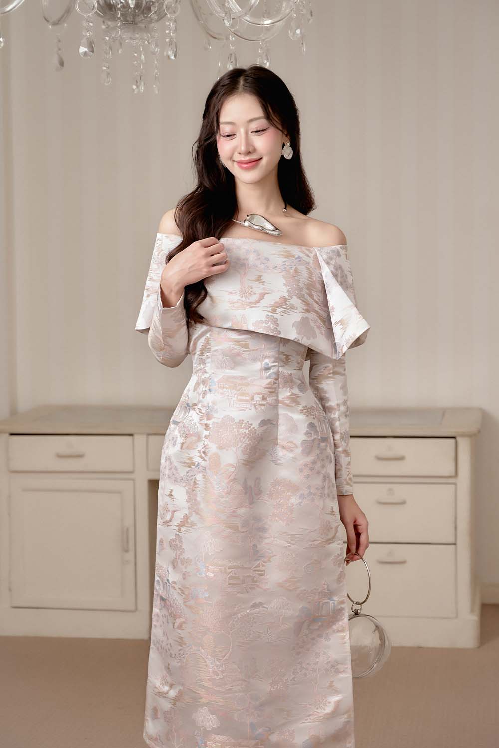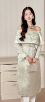Mixed with two colors, Slit on both sides, Floral brocade pattern, Draped off-shoulder , Dart lines