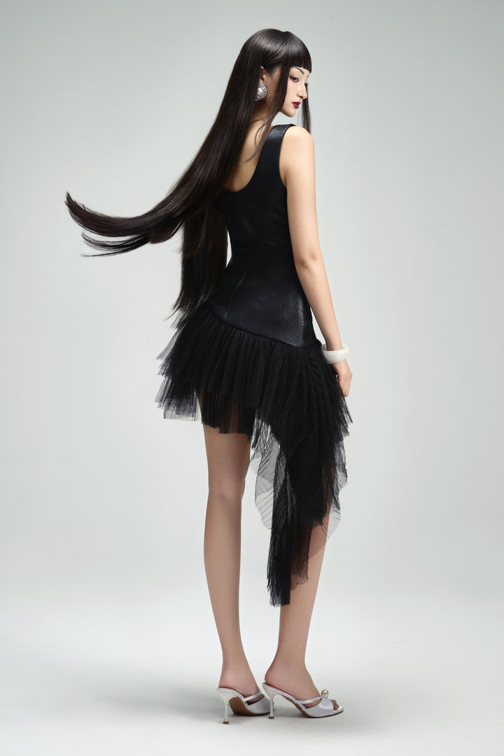 The dress features a contemporary asymmetrical design paired with a relaxed loose strap, offering a sophisticated yet effortless look. Crafted from soft felt material, this dress ensures comfort while maintaining a refined silhouette, perfect for stylish occasions where ease and fashion converge.