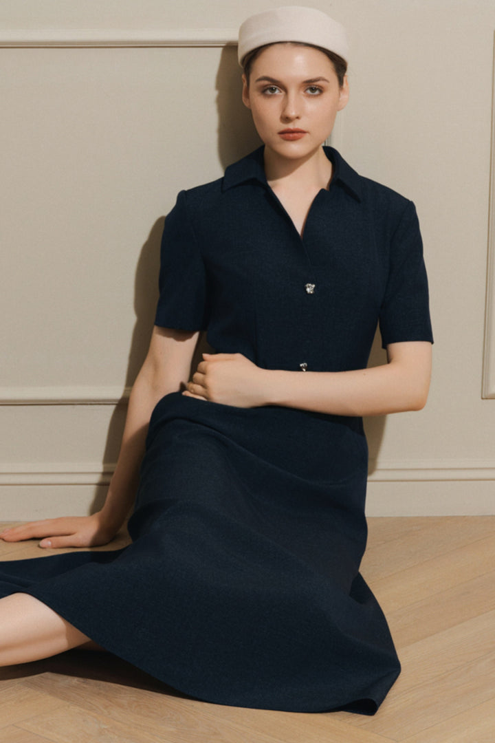 Expertly crafted from premium crepe, this A-line midi dress features a sophisticated collared neck, regular sleeves, and refined button embellishments. Its timeless silhouette ensures both comfort and style, making it perfect for office wear, brunch dates, or special occasions.