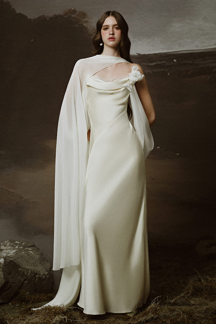 Mirena A-line Cowl Neck Silk Satin Floor Length Dress