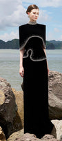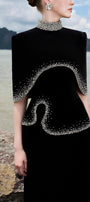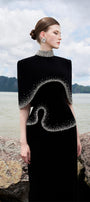 Curved hemline, Crystal-embellished at hemline and neckline, Square shoulder