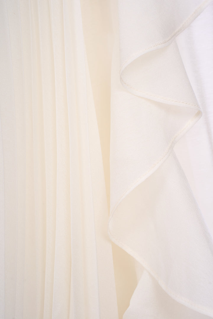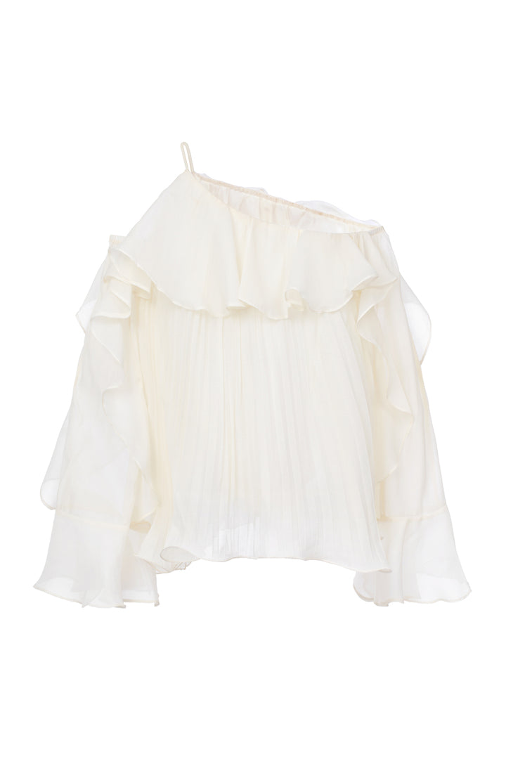 The top features an elegant off-shoulder design paired with a delicately pleated bodice, creating a refined silhouette. Crafted from lightweight organza, this top offers a subtle sheen and structured shape, while the blouson fit and ruffle trim add a sophisticated, feminine touch. Ideal for elevating both casual and formal ensembles with expert styling versatility.