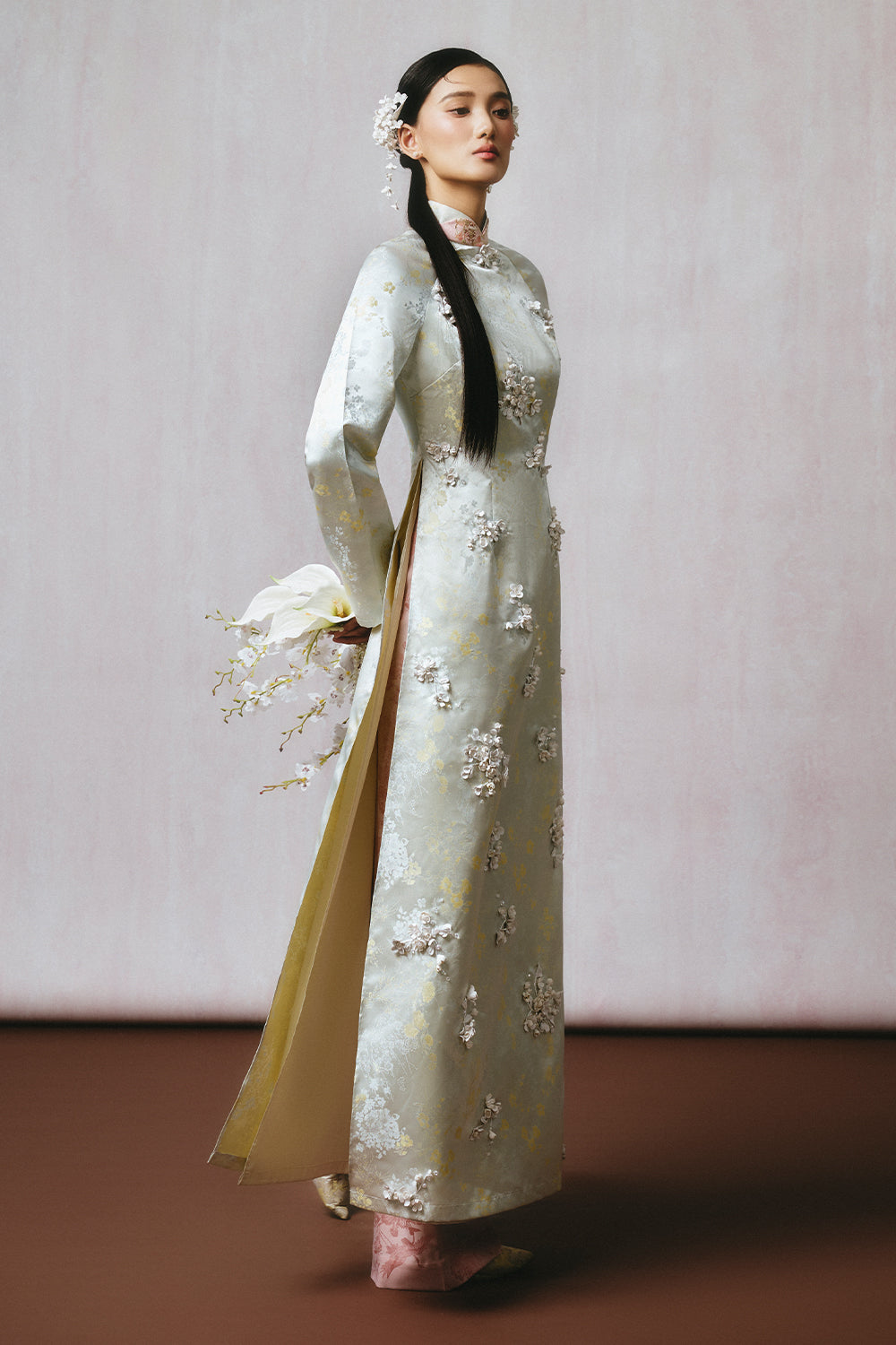 Elevate your wardrobe with this expertly crafted brocade Ao Dai, featuring a straight silhouette, mandarin neck, and regular sleeves. Intricate applique detailing delivers sophistication. Perfect for formal events, cultural celebrations, and festive occasions.