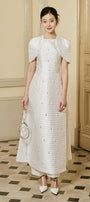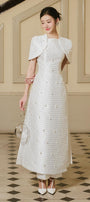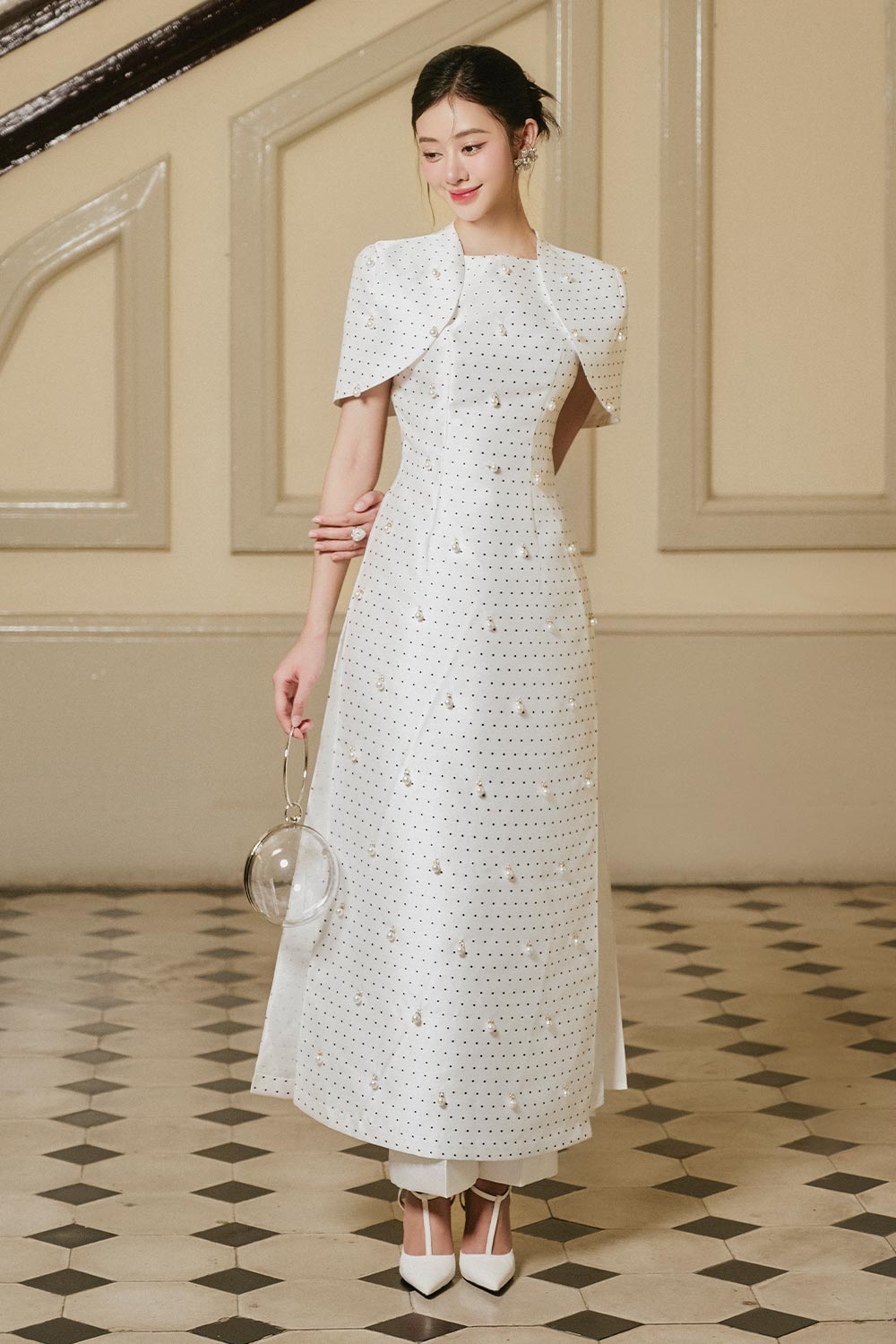 Crafted with luxurious taffeta fabric, this piece boasts a unique A-line shape and elegant cape sleeves. Perfect for special occasions, this dress will make you stand out in style. Elevate your wardrobe with this stunning Ao Dai.