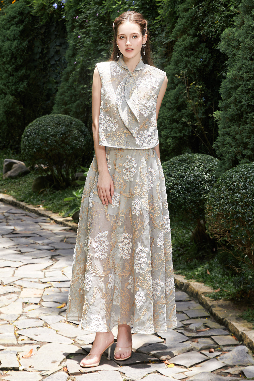 Elevate your wardrobe with this expertly crafted A-line skirt, featuring exquisite embroidery for a refined touch. Its classic silhouette flatters all figures, making it ideal for formal events, office wear, or elegant daytime outings.