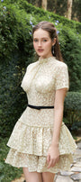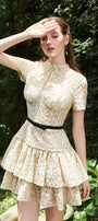 This A-line mini dress features a chic high neck and regular sleeves, elevated with delicate applique and embroidery. Expertly crafted, it delivers both sophistication and modern elegance. Ideal for cocktail parties, evening events, or upscale gatherings.