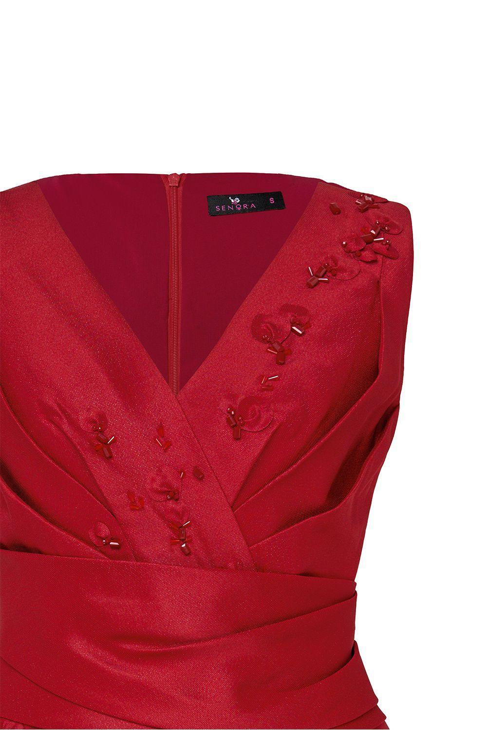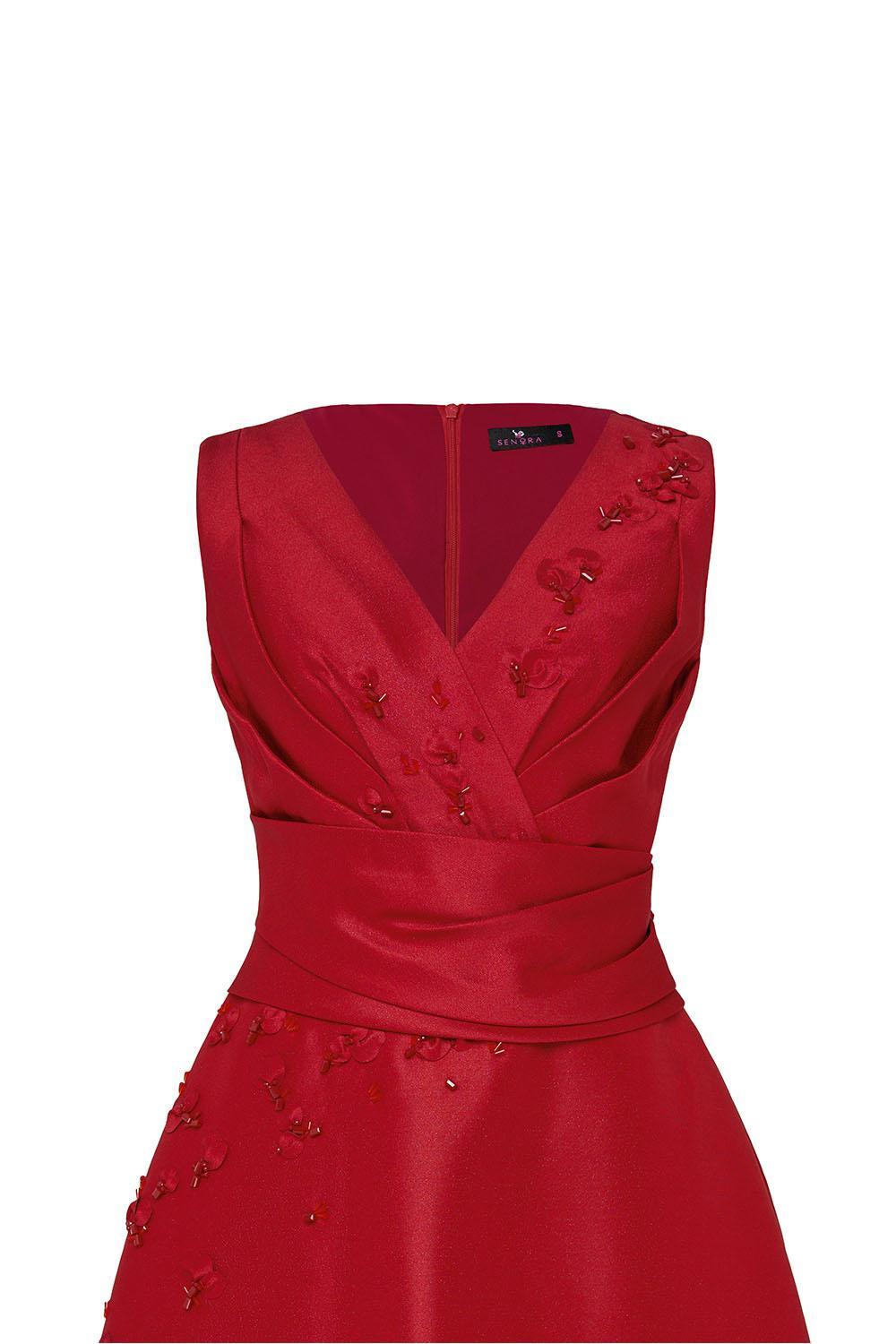 This dress boasts a flattering A-line silhouette and elegant sleeveless design. Crafted from high-quality organza fabric, this dress offers both comfort and sophistication. Perfect for any special occasion, this dress will have you feeling confident and stylish all day long.