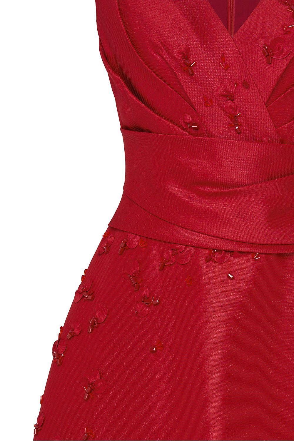 Fitted waist with draped deign, Attached 3D floral bead, Back zipper