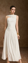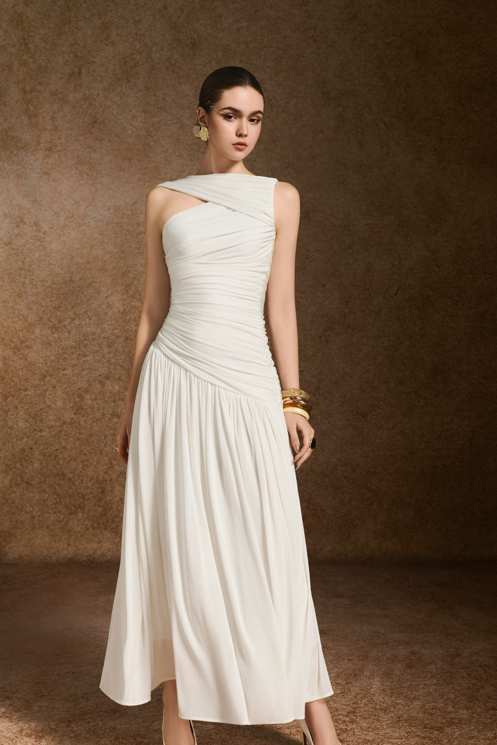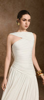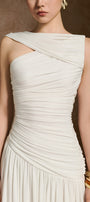 This dress features a sleek spandex fabric that ensures a comfortable, form-fitting silhouette. Its distinctive asymmetric neckline adds a modern edge, while the gathered bodice enhances shape and structure. Designed to fall gracefully to the ankle, this dress combines elegance with contemporary style, perfect for sophisticated occasions.