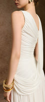 Asymmetric draped neckline, Gathered ruch bodice, Connect back flap from shoulder to waist