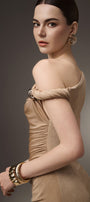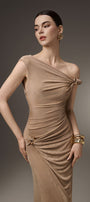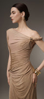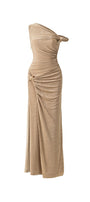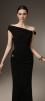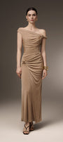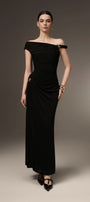 Expertly crafted for a flawless silhouette, the dress features an asymmetric off-shoulder design and a gathered, draped waist. Designed with a sheath fit, this ankle-length dress accentuates your curves and adds a touch of elegance to any occasion.
