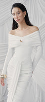 Sarong tie on the front, Gathered lower skirt and off-shoulder sleeves, A golden button on the chest