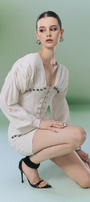 Elevate your style with this expertly designed linen mini dress. Featuring a sleek sheath silhouette, V-neck, cuff sleeves, pin tuck details, and chic button embellishments. Ideal for brunches, summer parties, or sophisticated casual events.