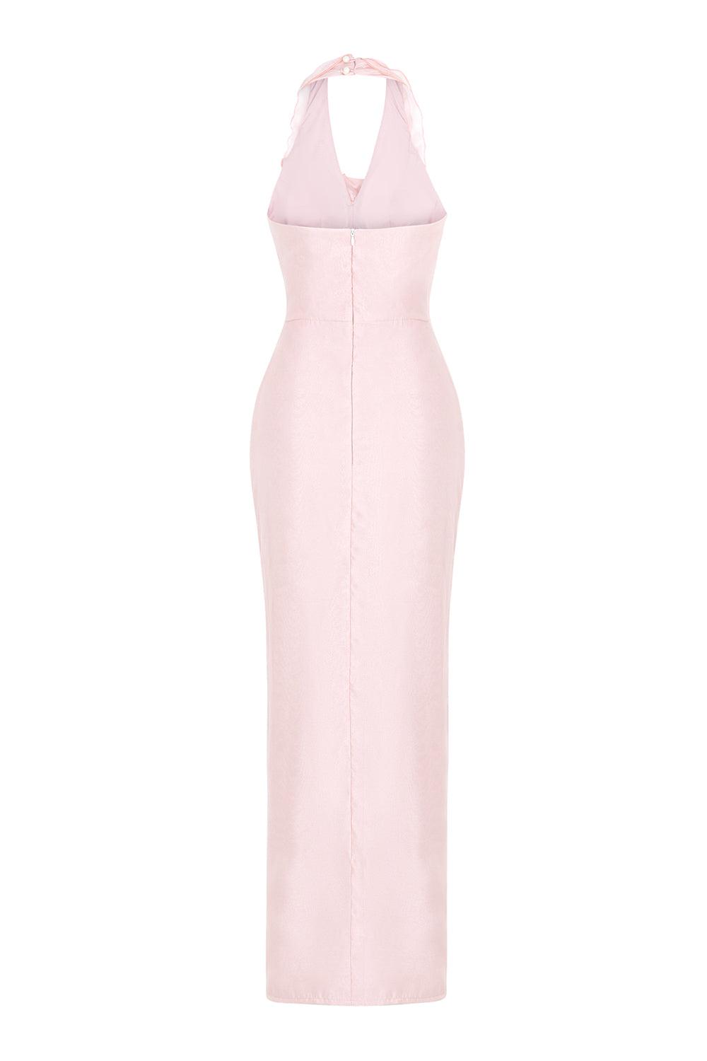 This dress is a delicate and elegant choice for special occasions. Made with luxurious silk organza, this dress features a plunging neckline and a back zipper for a flattering fit. Its ankle length adds a touch of sophistication, making it the perfect choice for formal events.