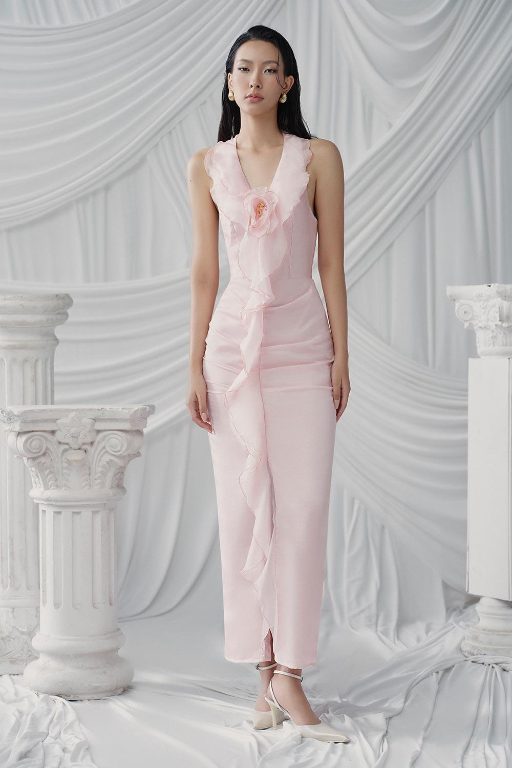 Ruffle trim on the center, Applique floral on the chest, Draped lower skirt, Plunging neck