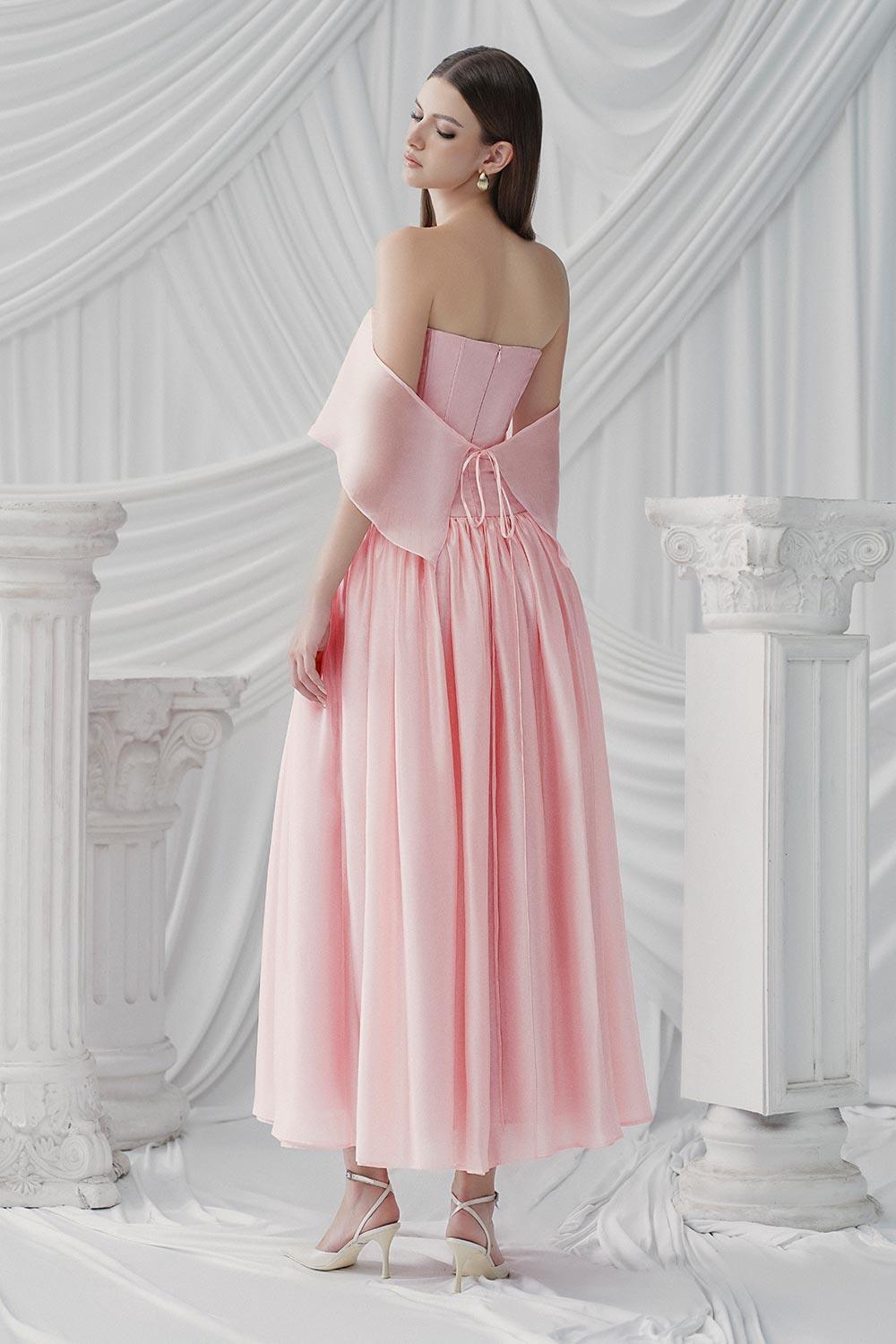 The midi dress exudes elegance and sophistication, expertly crafted with gathered silk organza and an off-shoulder design. The luxurious fabric not only provides a soft and silky feel, but also gives a lightweight and flowy silhouette, making it perfect for special occasions.