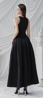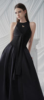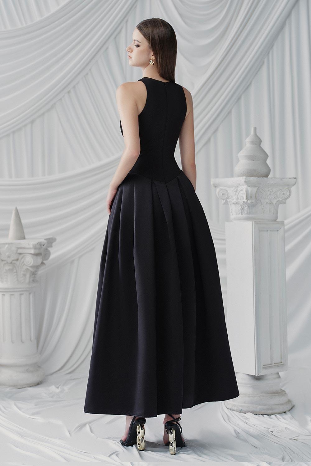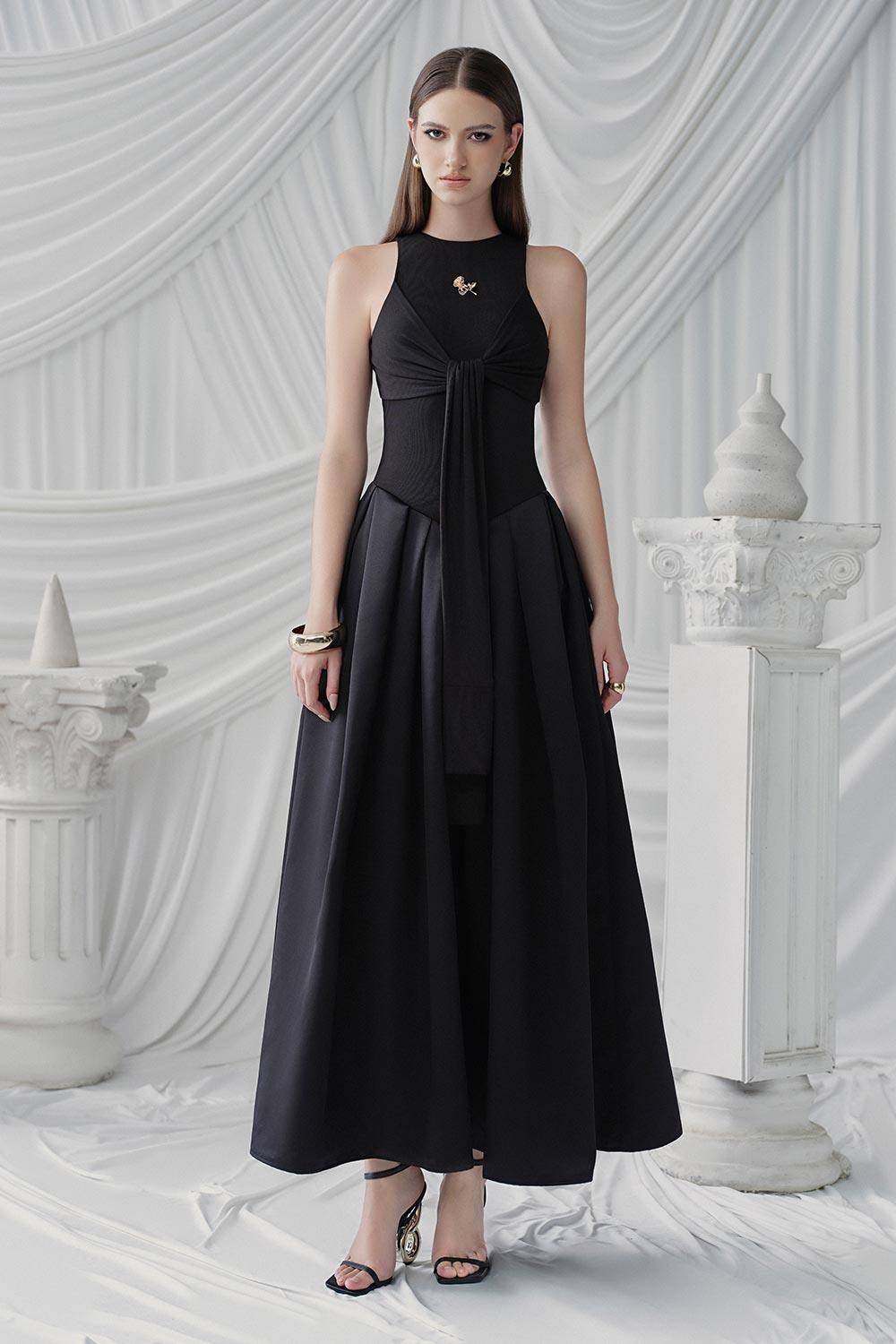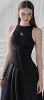Detachable flap tie front and back, Draped skirt, Golden button on the chest