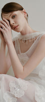 Asymmetric layers, 3D flower applique, See-through outer layer, Long scarf neck with bead tassels, Side slit