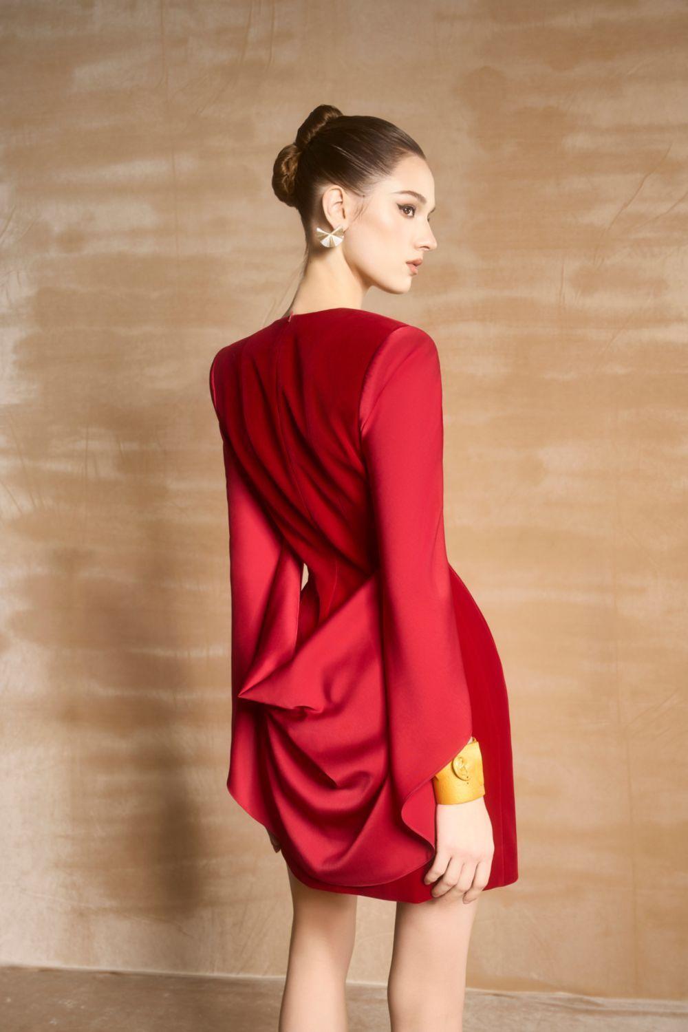 إدخال اللباس. يتميز هذا الفستان الفاخر بتصميم غمد ونسيج مخملي فاخر، ينضح بالأناقة والرقي. تضيف الأكمام ذات الرداء لمسة من الدراما والذوق، مما يجعلها الخيار الأمثل لأي مناسبة خاصة.