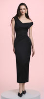 The dress features a sleek sheath silhouette enhanced by a distinctive asymmetric shoulder design. Crafted from smooth poly silk, it offers a subtle sheen and fluid drape that accentuate the body's natural lines. This midi-length dress combines modern architectural detail with expert tailoring, making it an ideal choice for sophisticated events requiring refined style.