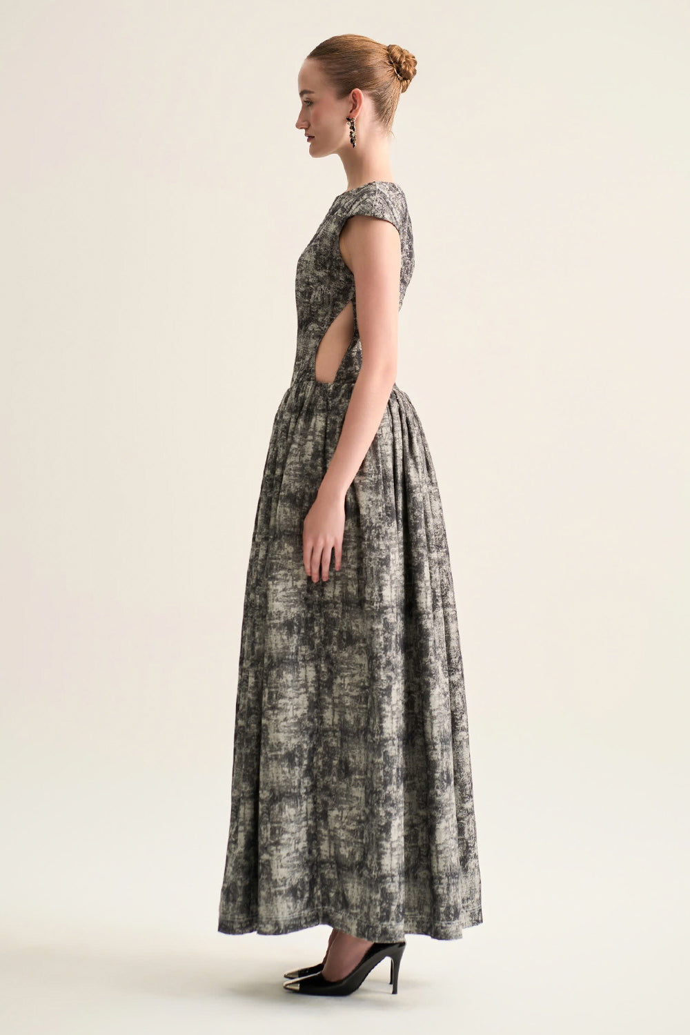 Cut-out detail on the side waist, Gathered puffy hip