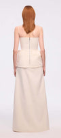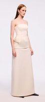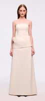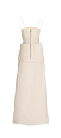 The structured silhouette gently skims the body, providing a slim yet comfortable fit that accentuates the natural contours without feeling restrictive. A defining design feature is the architectural draping around the hips, which adds dimension and visual intrigue to the minimalist aesthetic. The dress’s interlining ensures a stable form, delivering both structure and functionality for effortless movement and wearability. With its refined strap design and full-length cut, this dress is perfect for formal occasions, exuding timeless elegance and understated sophistication.