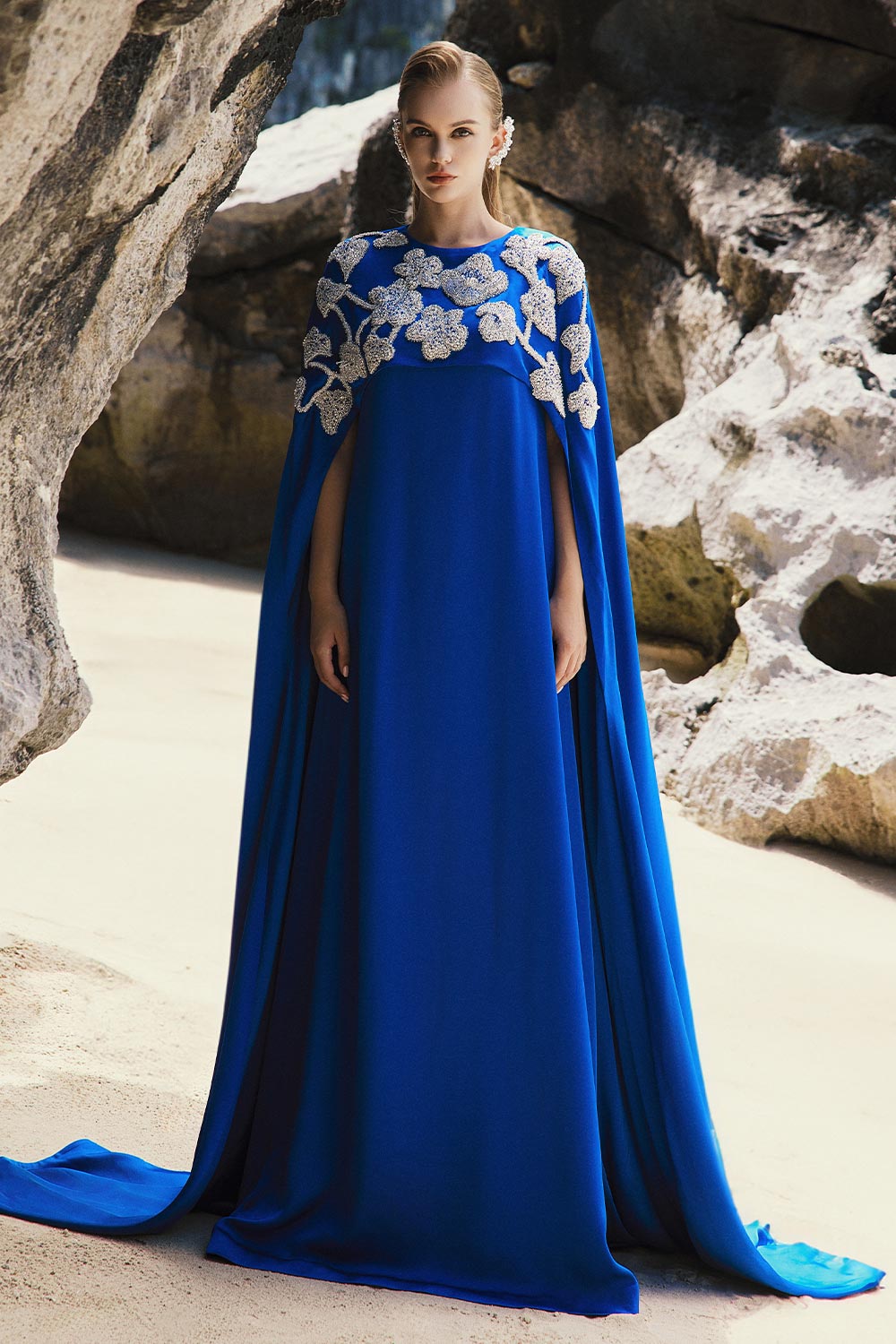 This dress features a unique tent cape shoulder design, adding a touch of elegance to your outfit. The lightweight silk fabric drapes beautifully, creating a floor length silhouette that is both sophisticated and comfortable. Perfect for special occasions, this dress is sure to make a statement.