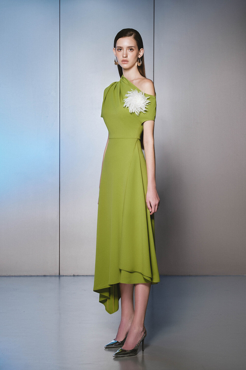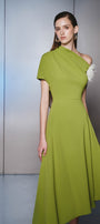Expertly designed with an asymmetric cut, the dress boasts a bold and stunning green color. Made with a luxurious blend of cotton and silk, it offers both style and comfort. Elevate your wardrobe with this calf-length dress.
